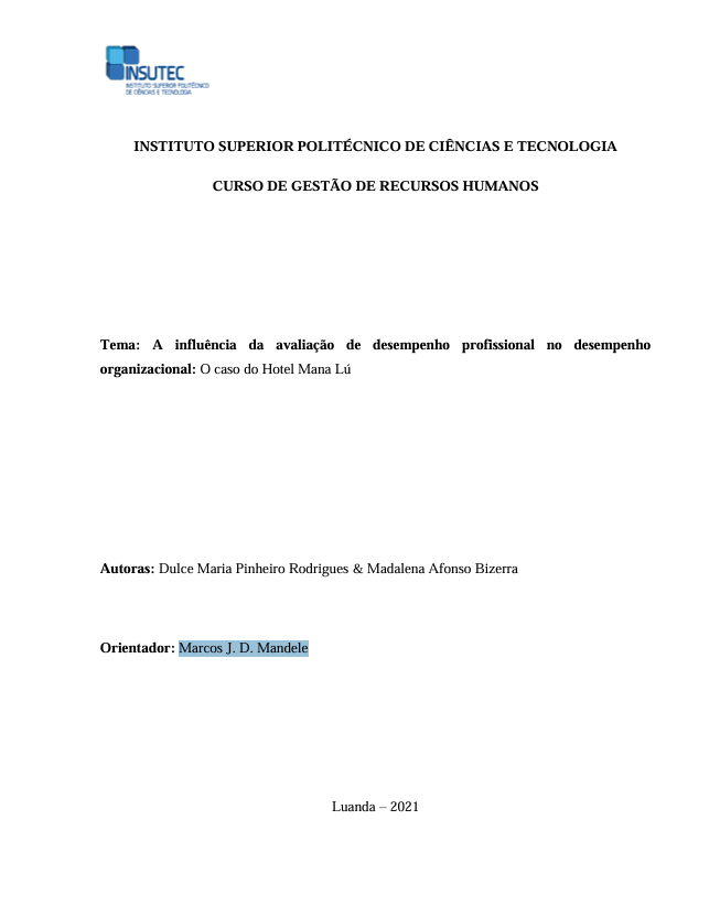 A presente pesquisa tem como objectivo descrever a influência da avaliação do desempenho profissional no desempenho organizacional do Hotel Mana Lú, a partir da perspectiva dos profissionais inquiridos. Para responder a pergunta que nor...