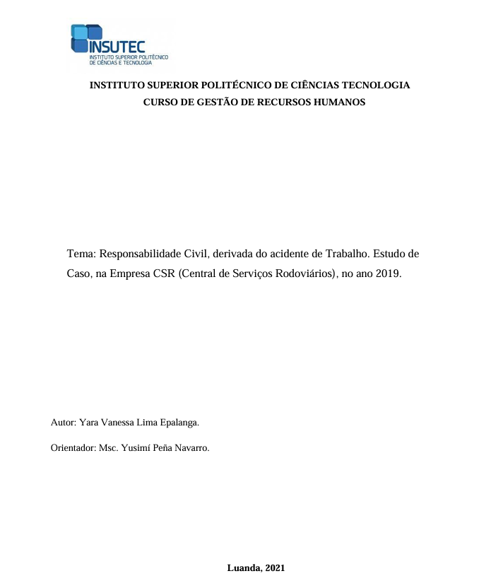 Mostrar maisCom o presente trabalho de investigação científica pretende-se descrever o procedimento relativo à responsabilidade civil, seguido no ano 2019 pela Empresa CSR (Central de Serviços Rodoviários), ao sofrer seus funcionários, um acidente de trabalho. Os procedimentos metodológicos adoptados para o desenvolvimento desta pesquisa foram conduzidos através de um estudo de caso realizado a partir de um inquérito aplicado a 7 Sinistrados da empresa, no ano 2019, e a entrevista realizada a Chefe de Departamento da Empresa. O estudo se configurou em uma abordagem de natureza básica que desde o ponto de vista dos seus objectivos classificou-se como uma pesquisa descritiva, utilizando-se o método Dedutivo e Estatístico, para cumprir com o mesmo determinou-se verificar os acidentes que aconteceram no ano de 2019, saber as circunstâncias que originaram os acidentes de trabalho, conhecer o procedimento relativo a responsabilidade civil seguido pela empresa quando ocorre um acidente de trabalho, e conhecer os benefícios que recebe o trabalhador acidentado.