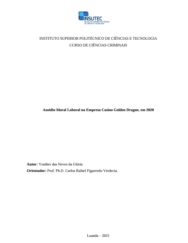 Mostrar maisNa empresa Casino Golden Dragon, é visível o assédio moral laboral, fazendo com que haja elevados níveis de insatisfação por parte dos trabalhadores e um mau ambiente laboral. O presente trabalho aborda sobre ocorrência de assédio moral laboral na referida empresa, com a intenção de descrever, caracterizar formas de assédio moral bem como formas de como prevenir esta manifestação de comportamentos desviantes praticados na empresa. Buscou-se de diferentes teorias sociológicas sobre comportamento desviante objetivando contribuir para o melhoramento daquele ambiente laboral, atraindo a atenção de quem de direito bem como fomentar debates, tornar mais conhecido o assunto em tela para uma maior prevenção do fenómeno. Ainda, demonstra a triste realidade de uma empresa em que se verifica um déficit organizacional que favorece a ocorrência da violência perversa podendo advir dos distintos níveis hierárquicos, ocorrendo dentro e fora da jornada laboral, motivada pela extrema competitividade, má comunicação, comportamento hostil associado a excessiva carga horária e ascensão à cargo. Para alcançar os objectivos foi realizado uma pesquisa descritiva. Quanto aos métodos utilizaram-se, do nível teórico ou de abordagem o dedutivo-indutivo, análise-sínteses e o hipotético-dedutivo; dos métodos de nível empírico ou de procedimentos a entrevista e o questionário para a recolha de dados e o estatístico para o processamento da informação, além da observação direita não participante.