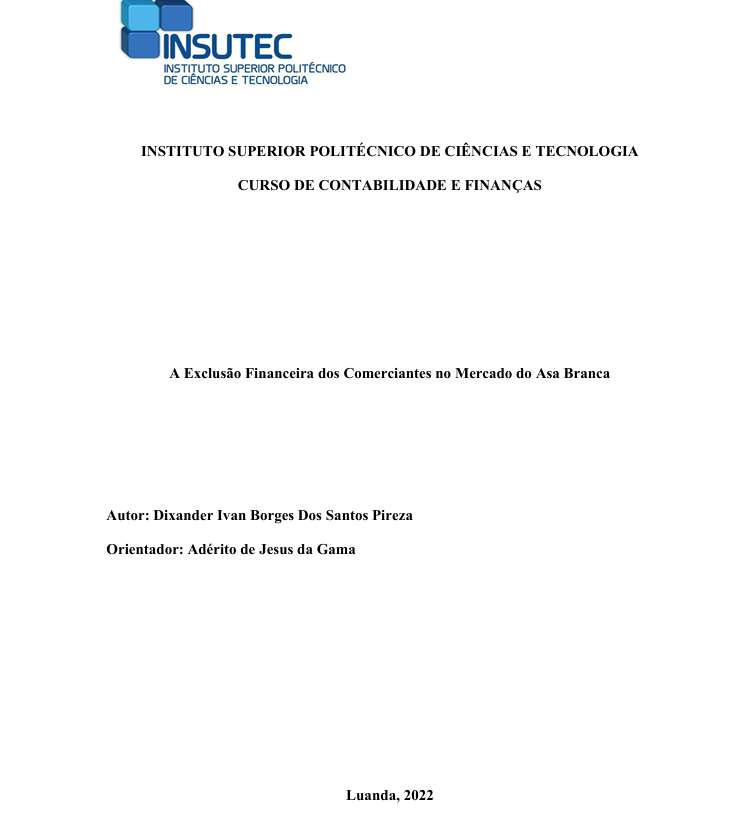 A exclusão financeira refere-se ao processo em que as pessoas encontram dificuldades para acessar ou utilizar os produtos e serviços financeiros no mercado tradicional que sejam adequados às suas necessidades e que as permitam levar uma vida social normal na sociedade a qual estão inseridas. O presente trabalho é um estudo de caso realizado no mercado do Asa Branca, e teve como objectivo principal, analisar os principais factores de exclusão financeira dos comerciantes no mercado do Asa Branca. O estudo classifica-se como explicativo, pois o mesmo visou identificar, analisar e esclarecer quais os factores de exclusão financeira dos comerciantes no mercado do Asa Branca, tendo-se identificado como principais factores: a falta de informação sobre o sistema financeiro, a desconfiança das instituições financeiras, a falta de tempo e as falhas constantes no sistema. A maior parte dos comerciantes não bancarizados gostariam de ter conta bancária, maioritariamente para poupar, obtenção do multicaixa, recepção de pagamentos e por segurança. Para a recolha de dados, foram utilizadas técnicas como o inquérito por questionário e uma entrevista do tipo estruturada, em uma amostra probabilística aleatória simples. A análise e interpretação dos dados foi feita por intermédio da estatística descritiva, com o auxílio do programa Microsoft Excel, as respostas do inquérito foram interpretadas e ajudaram a compreender melhor o fenómeno desde a bancarização ao acesso digital, utilizando assim uma abordagem qualitativa e quantitativa dos dados. Os métodos utilizados no estudo foram dedutivo-indutivo, hipotético – dedutivo e analise – síntese.