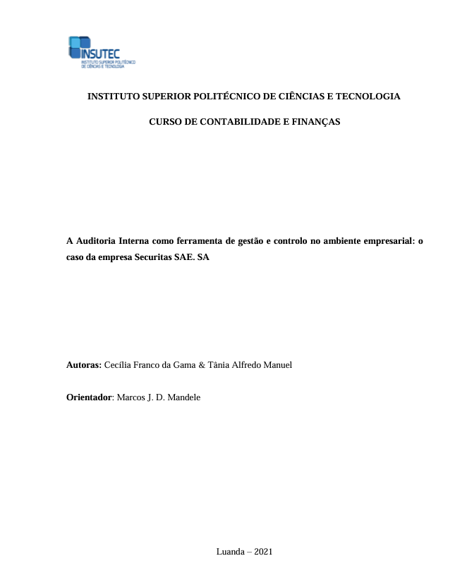 A presente monografia tem como objectivos descrever as técnicas da auditoria interna empregadas na gestão e controlo interno da empresa Securitas SAE.SA, a partir da óptica dos profissionais entrevistados. Para responder a pergunta que conduziu a pesquisa, assim como o objectivo geral foi possível realizar uma pesquisa básica de abordagem qualitativa e descritiva de campo, permitindo descrever a realidade da empresa objecto deste estudo. Os dados foram colectados por meio de uma entrevista semi-estruturada e analisados com a técnica de análise de conteúdo de Bardin (2011) e, que permitiu as pesquisadoras analisar os dados subjectivo utilizando o método hipotético- dedutivo. Participaram neste estudo como sujeitos de pesquisa seis (6) funcionários da empresa encarregados pelas actividades de auditoria interna. O fundamento teórico baseou-se em teorias sobre Auditoria e controlo interno apresentado por vários autores e, o mesmo foi apropriado para desenvolver a presente pesquisa. Os resultados indicam as técnicas da auditoria interna utilizadas na gestão e controlo do ambiente empresarial na empresa Securitas SAE.SA.